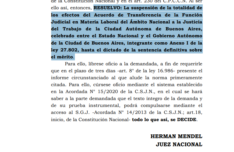 El Juzgado Nacional de Primera Instancia del Trabajo N.º 30 resolvió suspender de manera provisoria los efectos del acuerdo que disponía la transferencia de la Justicia Nacional del Trabajo a la órbita de la Ciudad de Buenos Aires, tras una presentación realizada por la Unión de Empleados de la Justicia de la Nación (UEJN).