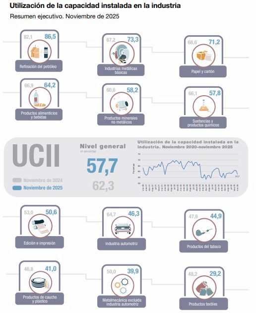 A nivel general, la utilización de la capacidad instalada industrial fue de 57,7% en noviembre, frente a 62,3% en noviembre del año pasado. La comparación interanual muestra un deterioro significativo del conjunto de la industria.