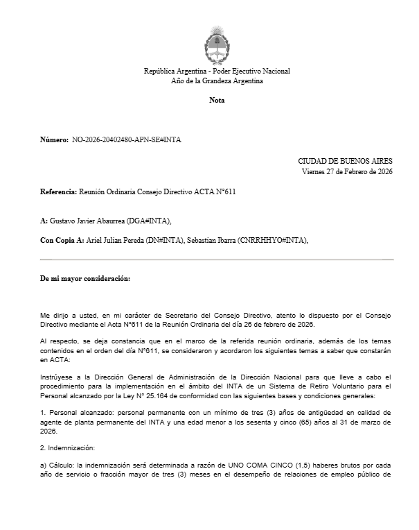 El retiro voluntario en el INTA se convocará en un plazo de treinta días corridos a partir del 1° de abril de 2026, prorrogable por única vez por quince días corridos a solicitud de la Dirección Nacional, agrega la normativa emanada del Consejo Directivo.
