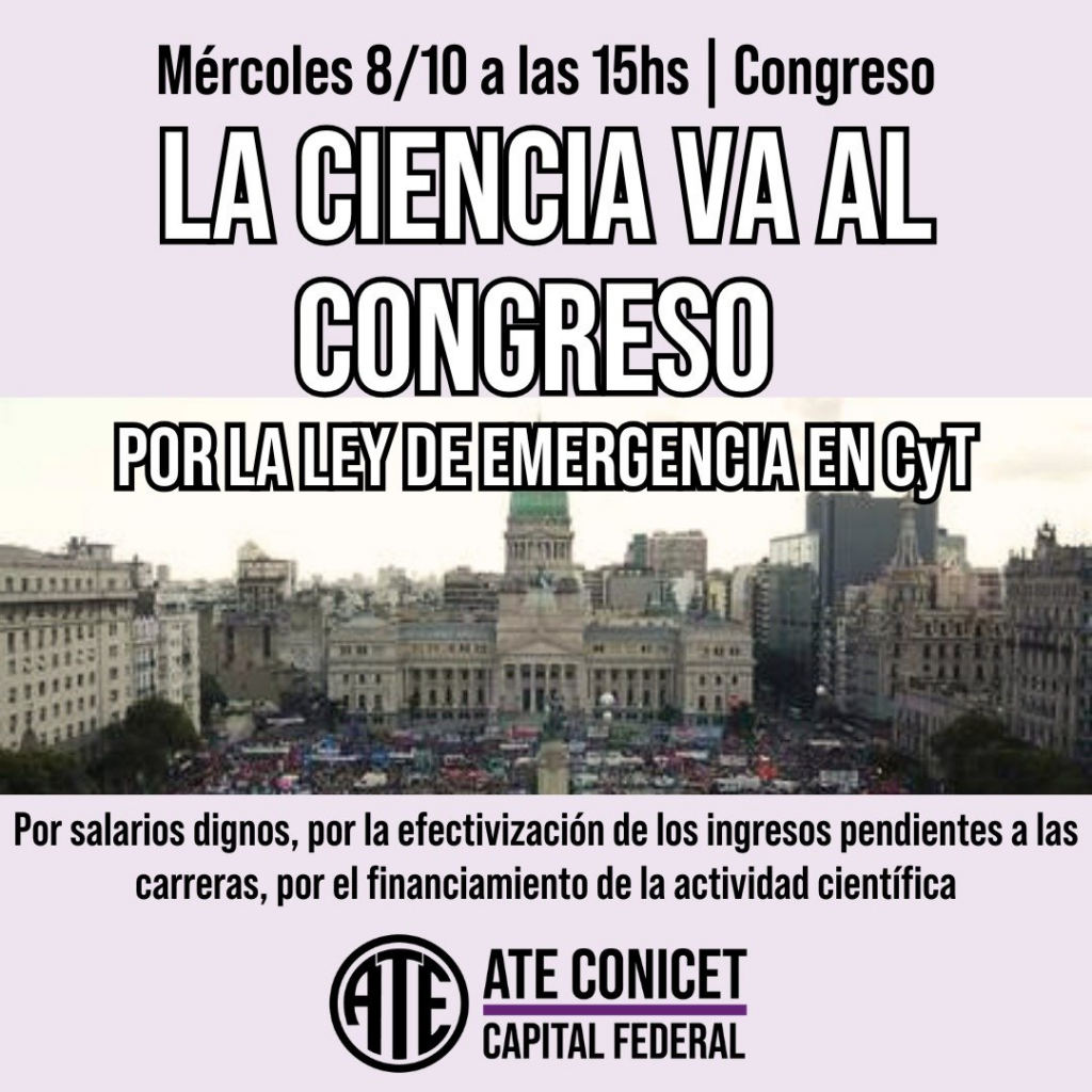 Trabajadores y trabajadoras del CONICET, organizados en la Asociación de Trabajadores del Estado (ATE), se movilizaron este miércoles frente al Congreso Nacional para exigir el tratamiento y la aprobación de la Ley de Emergencia en Ciencia y Tecnología, actualmente en debate en la Cámara de Diputados.