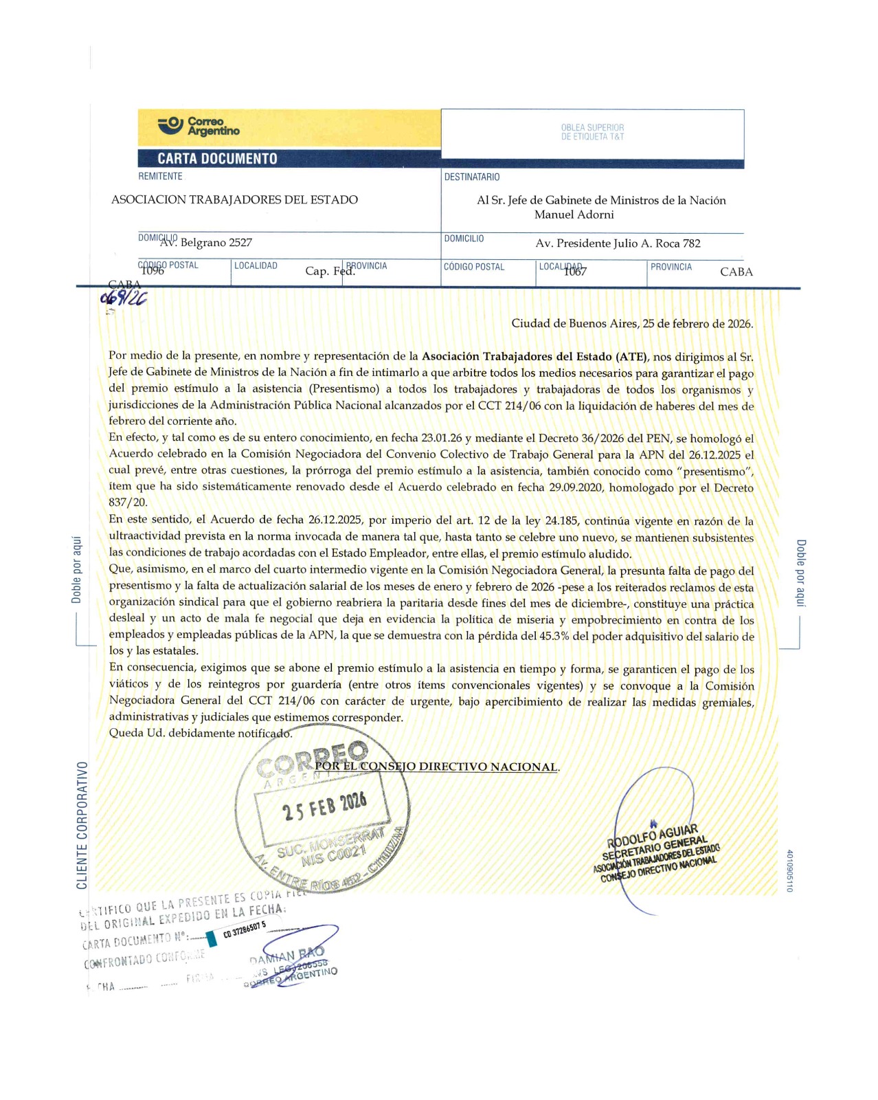 ATE además señala “que la presunta falta de pago del presentismo y la falta de actualización salarial de los meses de enero y febrero de 2026 constituye una práctica desleal y un acto de mala fe negocial que deja en evidencia la política de miseria y empobrecimiento en contra de los empleados y empleadas públicas de la Administración Pública Nacional”.