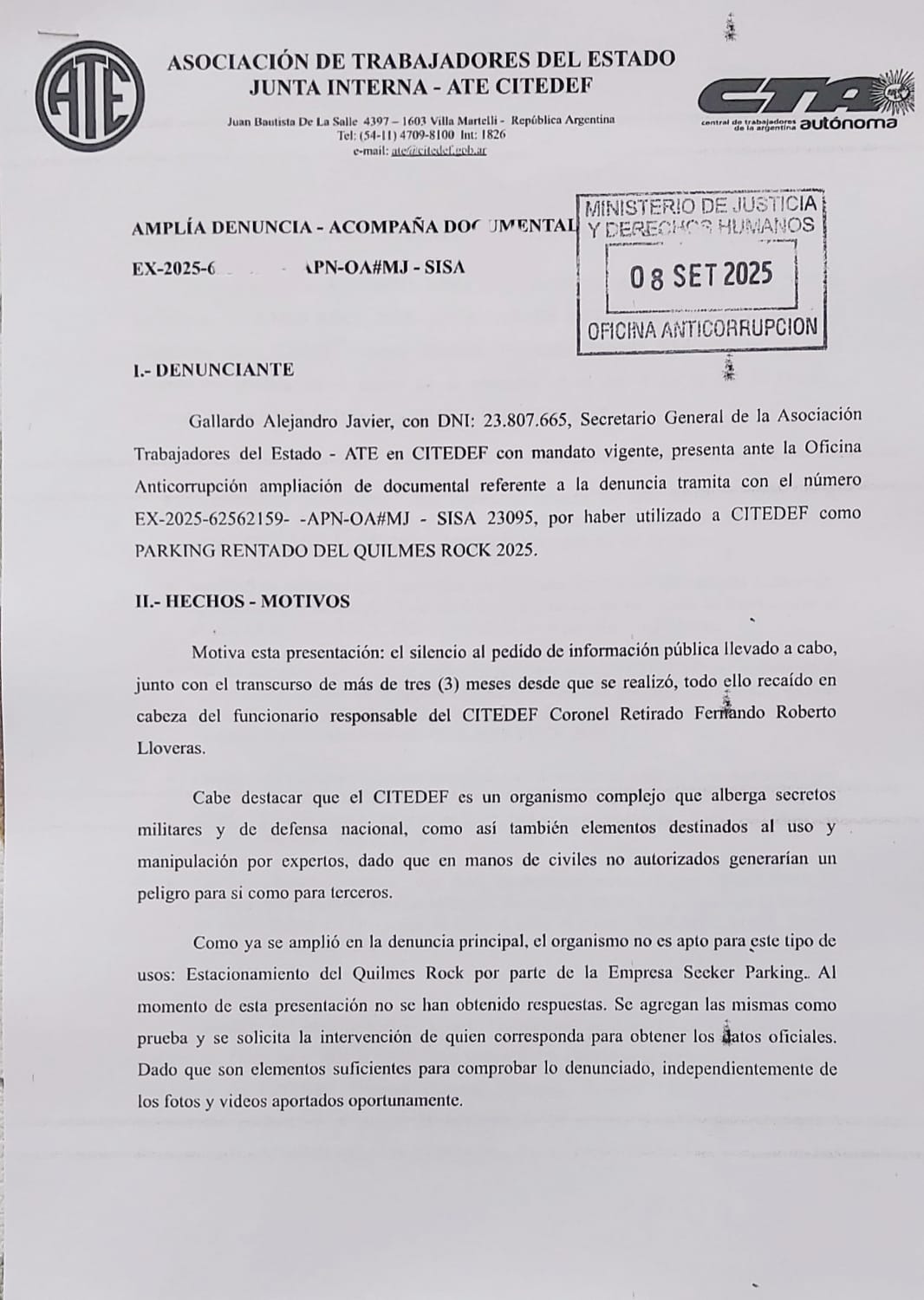 La Asociación Trabajadores del Estado (ATE) realizará el lunes una presentación ante el fiscal Santiago Schiopetto, en la causa 3611/2025 en que se investiga al Ministro de Defensa, Luis Petri, por malversación de caudales públicos. En esta oportunidad, el Sindicato aportará evidencia sobre el escándalo que puso en riesgo la seguridad nacional cuando desde esa cartera cedieron a un privado el playón perteneciente al ministerio en Villa Martelli para el último Quilmes Rock y no hay información sobre el destino de la recaudación.