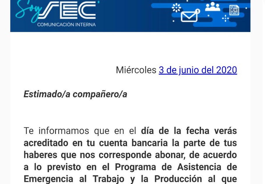 «Estimado/a Compañero/a: Te informamos que en el día de la fecha verás acreditado en tu cuenta bancaria la parte de tus haberes que nos corresponde abonar, de acuerdo a lo previsto en el Programa de Asistencia de Emergencia al Trabajo y la Producción al que estamos incorporados», abre un correo electrónico que recibieron ayer los empleados del Sindicato de Empleados de Comercio.