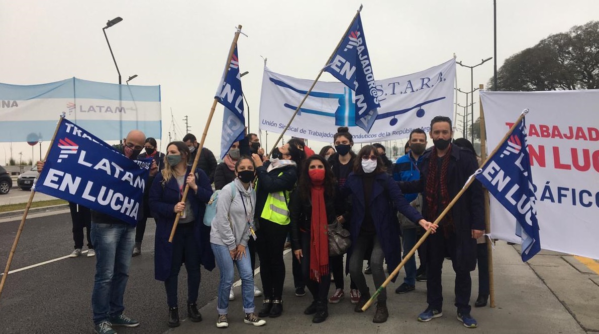 El sábado, empleados de la compañía y representantes gremiales manifestaron, una vez más, en la puerta de Aeroparque para apoyar a unos 30 empleados que desde el 13 de julio acampan en el hangar de LATAM. Con la consigna » #no a la extorsión «, los gremios reclaman la doble indemnización. La medida se vuelve a repetir hoy y promete continuar.