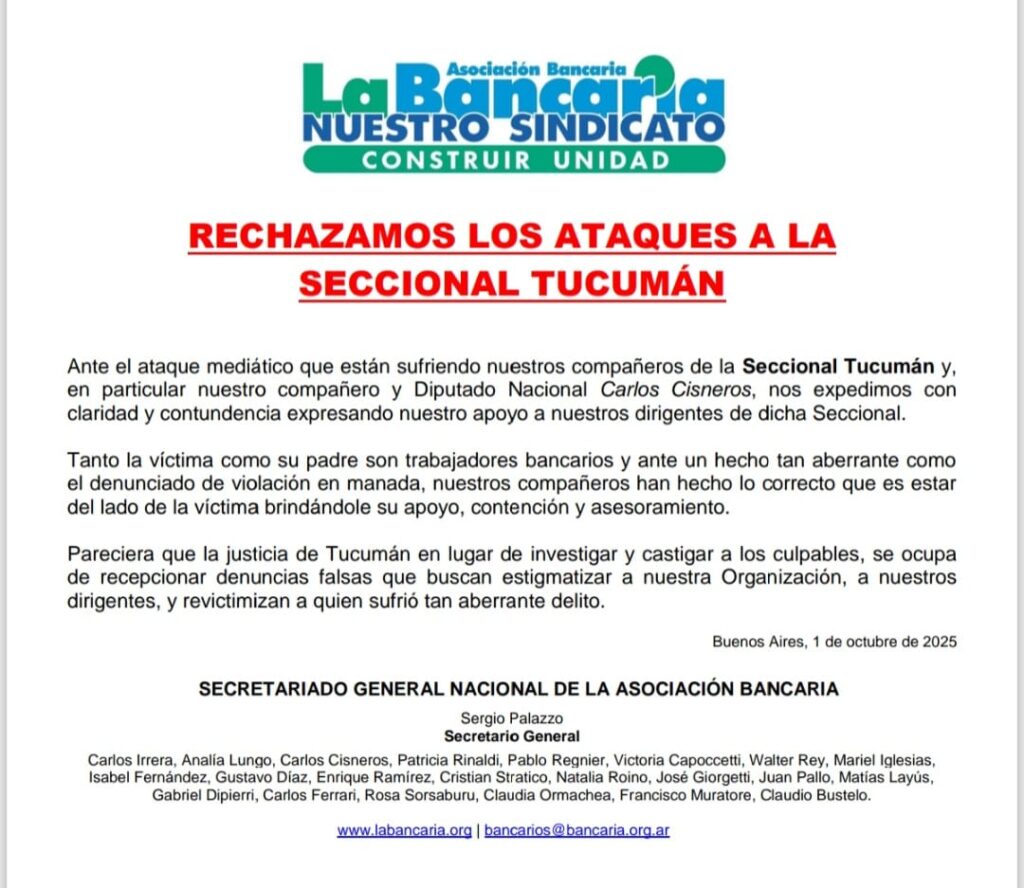 En paralelo, el Secretariado Nacional de la Asociación Bancaria, encabezado por Sergio Palazzo, expresó su apoyo a Cisneros y a la seccional Tucumán del gremio. En un comunicado de hoy, el sindicato a nivel nacional denunció una “operación mediática y judicial” contra sus dirigentes y criticó la actitud de la Justicia tucumana.