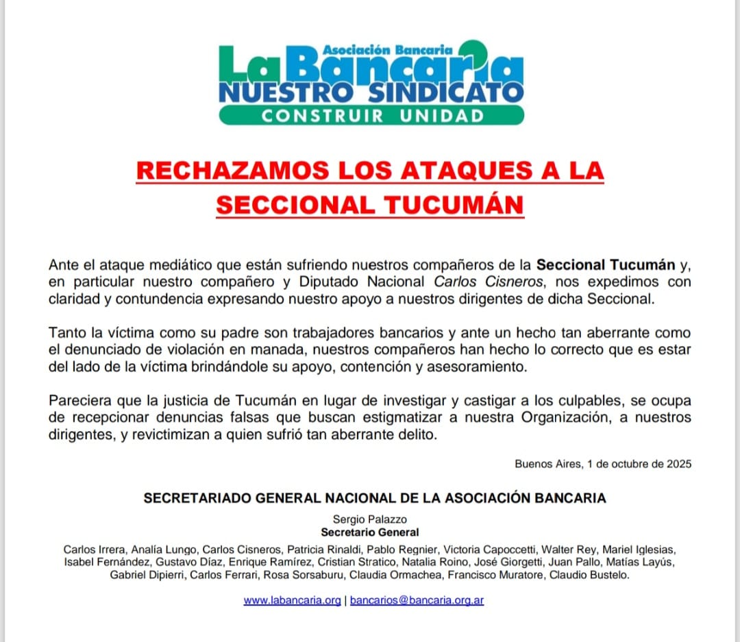 En paralelo, el Secretariado Nacional de la Asociación Bancaria, encabezado por Sergio Palazzo, expresó su apoyo a Cisneros y a la seccional Tucumán del gremio. En un comunicado de hoy, el sindicato a nivel nacional denunció una “operación mediática y judicial” contra sus dirigentes y criticó la actitud de la Justicia tucumana.