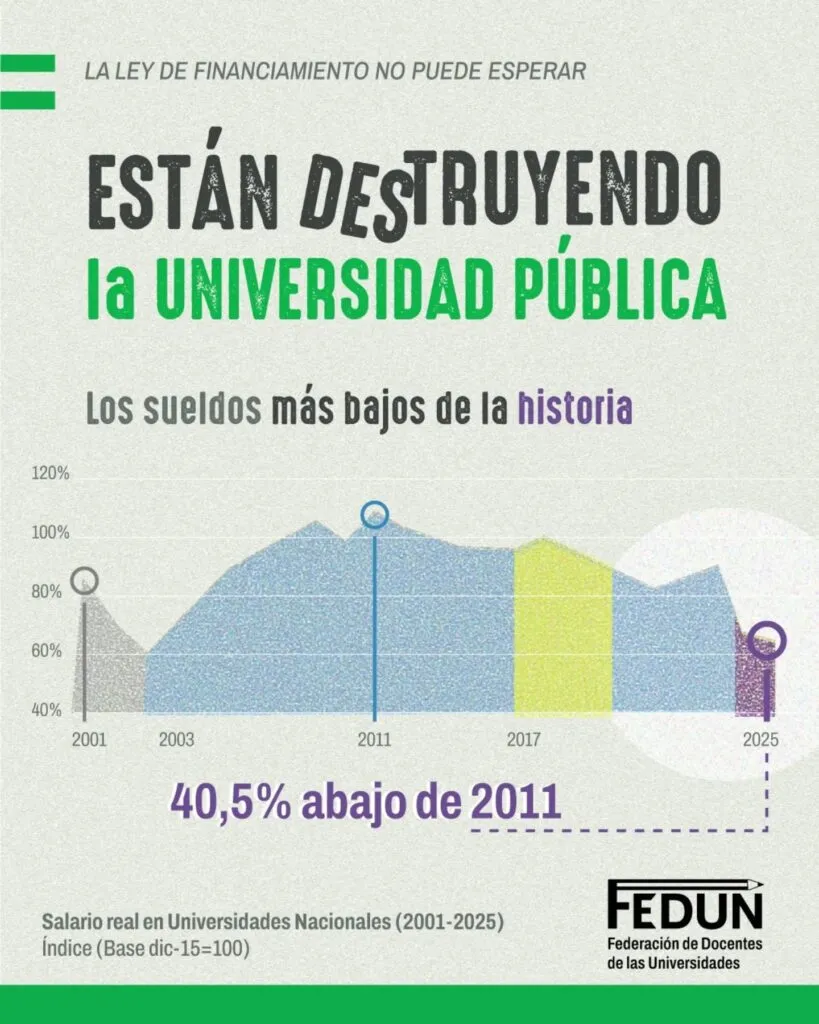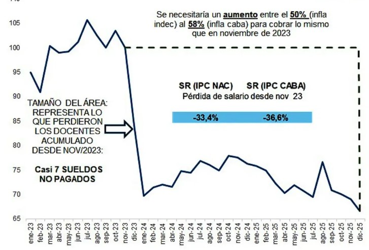 El Presidente argumentó que la ley atentaba contra el objetivo de alcanzar el “déficit cero”. Ese veto dejó sin respuesta el reclamo docente y profundizó la crisis en las universidades nacionales. Como resultado de esta política, en diciembre de 2025 los salarios acumulaban una pérdida del 33,4 por ciento de poder de compra respecto de noviembre de 2023, según el Instituto Nacional de Estadísticas y Censos (Indec). Si se toma el índice de la Ciudad de Buenos Aires, la caída asciende al 36,5 por ciento, de acuerdo con el informe de Iaraf.