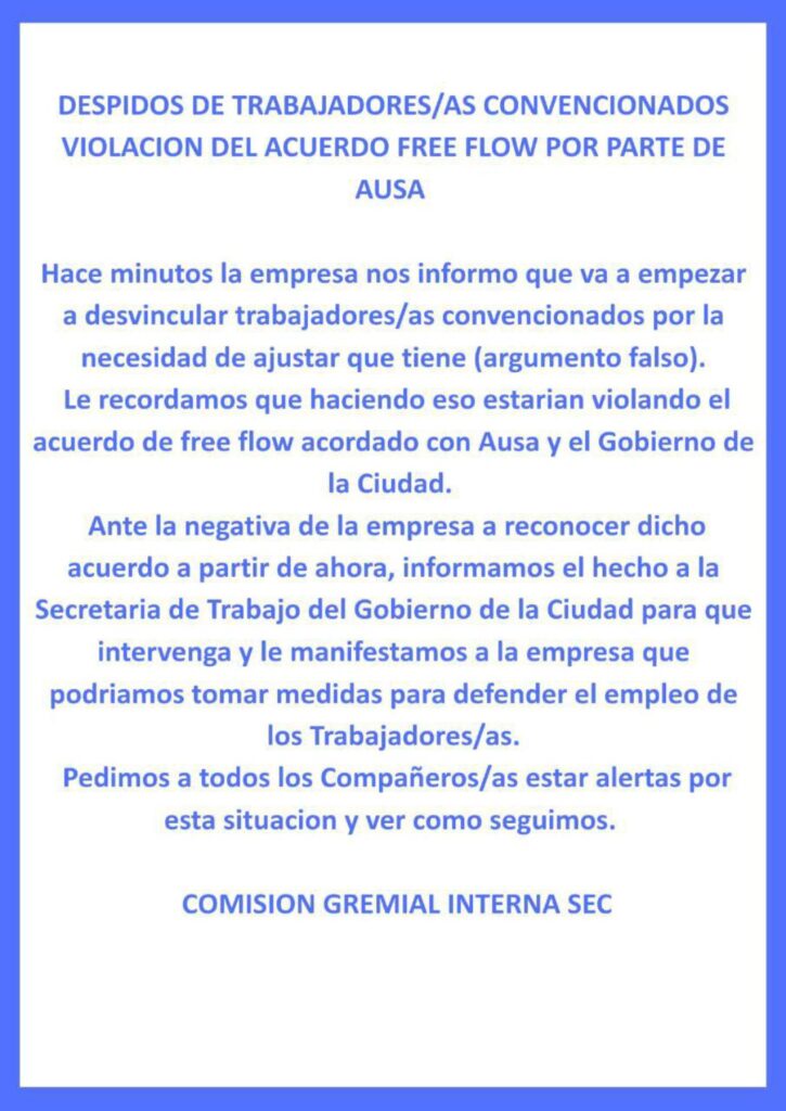 El conflicto se formalizó el 30 de marzo, cuando la comisión gremial interna denunció que la empresa había anunciado su intención de avanzar con desvinculaciones bajo el argumento de necesidades de ajuste, una justificación que el sindicato rechazó. En ese mismo comunicado, los representantes de los trabajadores informaron que notificaron la situación a la Secretaría de Trabajo porteña y advirtieron sobre la posibilidad de adoptar medidas de fuerza para defender los puestos laborales.