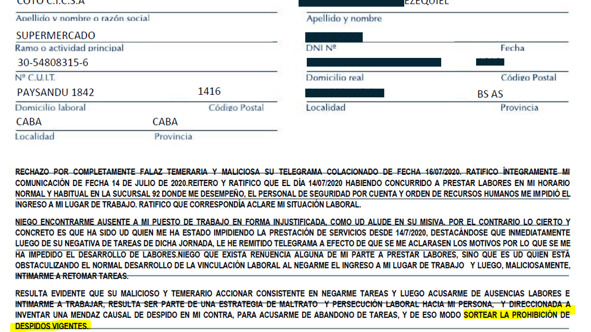 Las sospechas se confirmaron porque el telegrama de despido nunca llegó: «No me habían echado, esperaban que me vaya a mi casa para acusarme de abandono de trabajo. Ese mismo día me fui al Ministerio de Trabajo y, por medio de un abogado, mandé un telegrama de negativa de tareas y eso me salvó. A los dos días me respondieron el telegrama diciendo que era todo mentira, que ellos nunca me prohibieron el ingreso y que me presente a trabajar en 48 hs. Fui con un testigo y telegrama en mano y tampoco me dejaron entrar pero grabé todo«.
