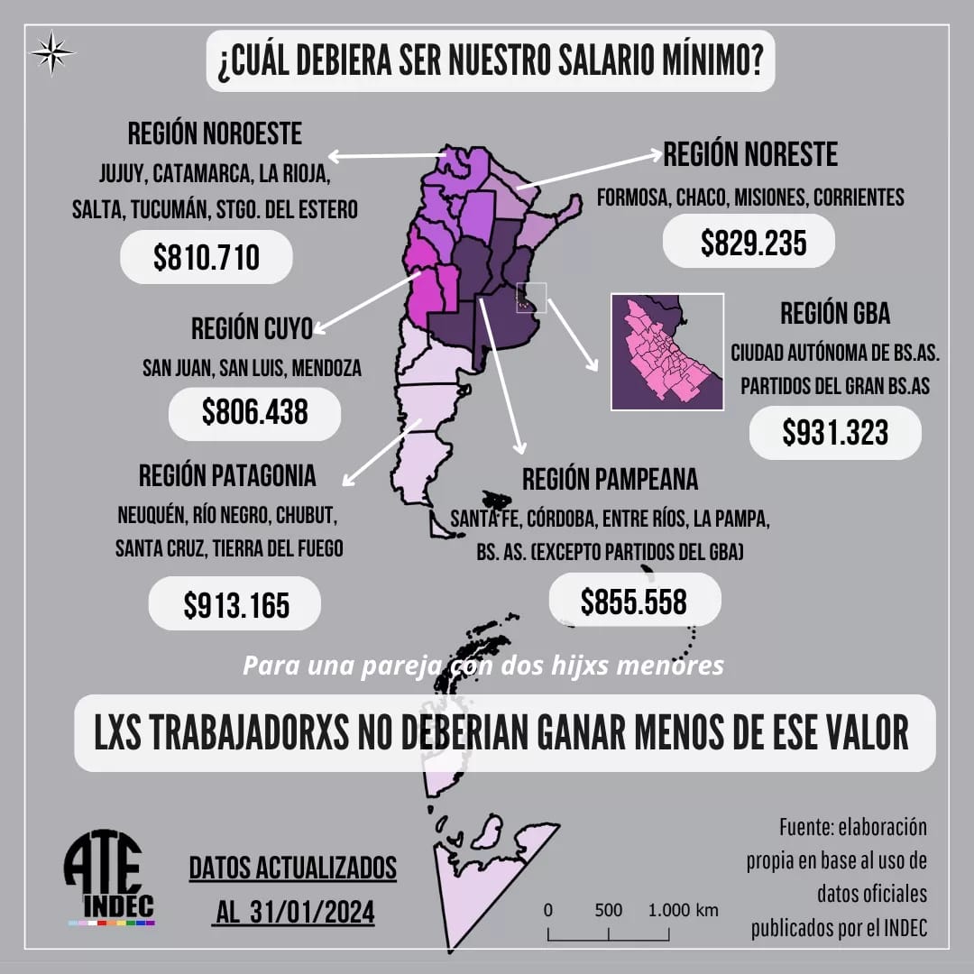 La Asociación de Trabajadores del Estado (ATE) del organismo aseguraron que según sus cifras: «Los trabajadores necesitaron, enero de 2024, $931.323.- para satisfacer sus necesidades mínimas de un hogar constituido por una pareja de 35 años con dos hijos/as en edad escolar».