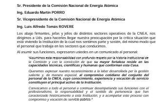 Directivos de diferentes áreas de la Comisión Nacional de Energía Atómica (CNEA) remitieron una carta a Martín Porro, el presidente del organismo para manifestarle su preocupación por los problemas de funcionamiento como consecuencia del brutal ajuste del gobierno nacional.