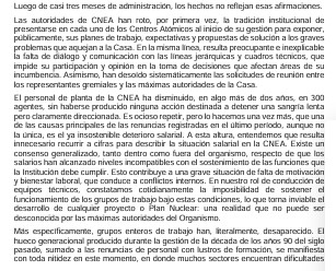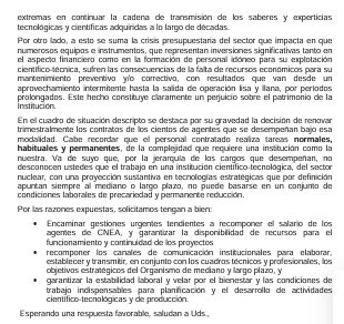 En la nota, las autoridades del organismo exponen con claridad los principales problemas que afectan el funcionamiento de la CNEA —entre ellos el deterioro salarial, la pérdida sostenida de personal, la precarización de las condiciones laborales y la falta de recursos— así como la necesidad urgente de recomponer estos aspectos para garantizar la continuidad de las actividades científico-tecnológicas.