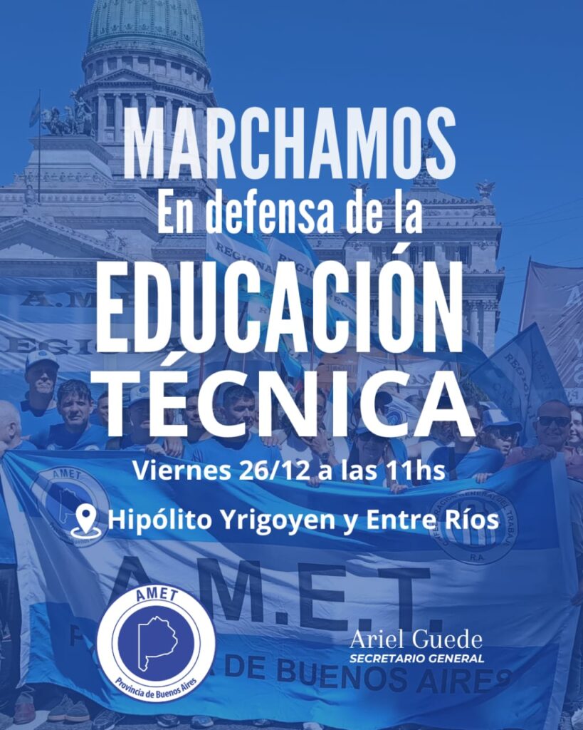 La marcha será hoy para protestar contra el Artículo del Presupuesto libertario que desfinancia la Educación Técnico Profesional. «Sin presupuesto no hay futuro, no hay talleres, no hay formación para el trabajo», sostuvieron desde AMET bonaerense.