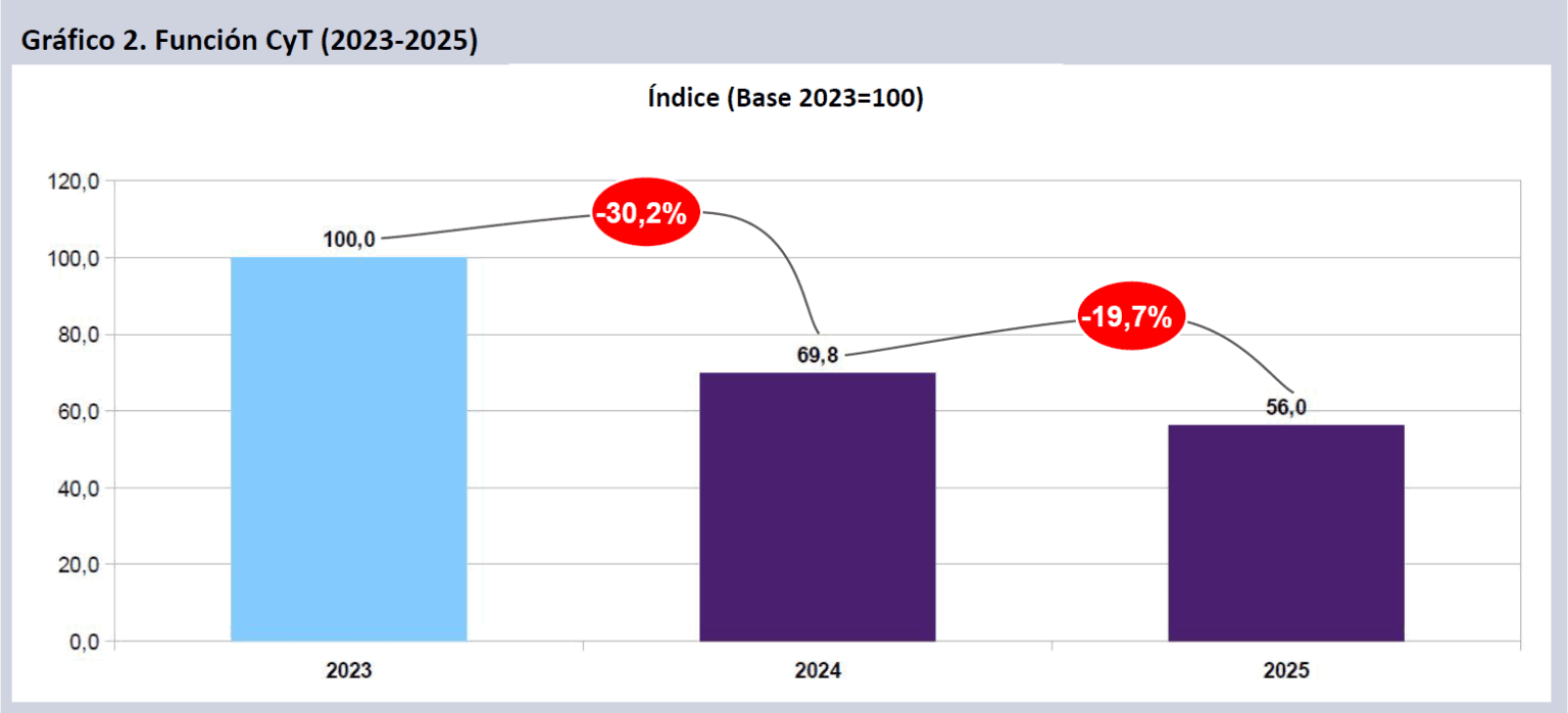 La Función Ciencia y Tecnología del Presupuesto se encamina a completar el año 2025 con una pérdida del 19,7% en términos reales, como consecuencia del retraso en el poder adquisitivo de los salarios y becas y, en simultáneo, la alta sub-ejecución en puntos como infraestructura y equipamiento.