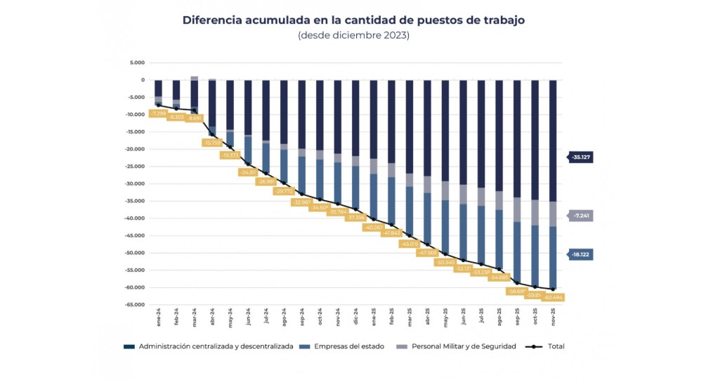 Según un informe difundido por el Ministerio de Desregulación y Transformación del Estado, entre diciembre de 2023 y noviembre pasado los empleos en la administración pública y las empresas estatales se redujeron en 60.494, una cifra que implicó un recorte del 12,1 %.