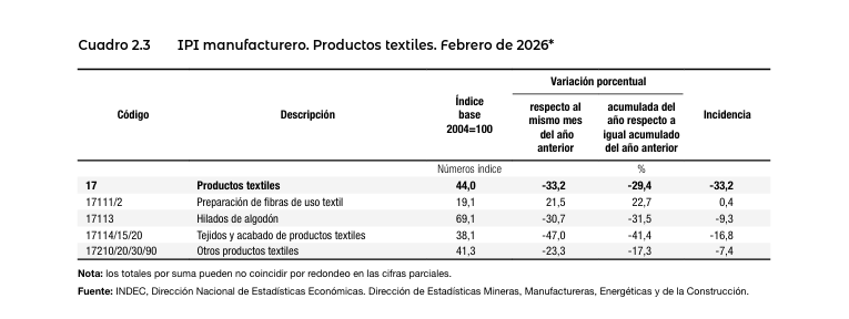 El sector textil en particular, de fuerte relevancia en el empleo, evidenció una de las mayores incidencias negativas, con una caída interanual del 47% en la producción de tejidos y una disminución del 30,7% en los hilados de algodón. Empresas del rubro señalaron que el retroceso está vinculado tanto a la caída del consumo como al aumento de las importaciones, que presionan sobre la producción local.