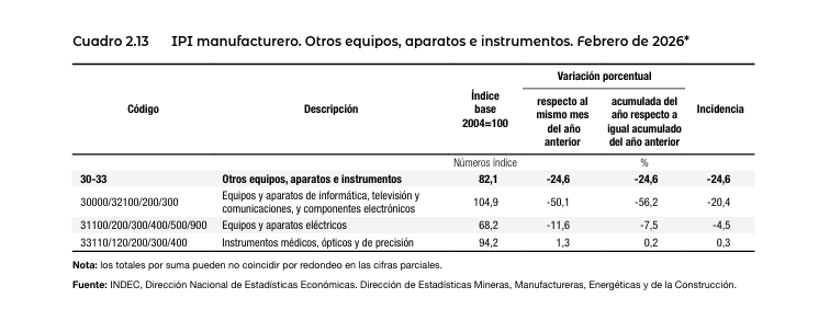 Otros rubros también mostraron desempeños negativos. La producción de productos de caucho y plástico cayó 15,7% interanual, afectada por la menor demanda de insumos industriales y envases, mientras que la fabricación de equipos electrónicos y de comunicación se desplomó más de 50% interanual, reflejando un fuerte freno en la actividad tecnológica.