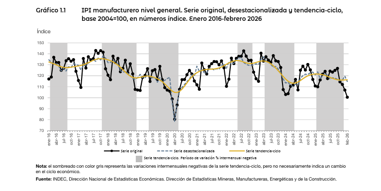 El informe también refleja un deterioro en términos mensuales. La serie desestacionalizada mostró una caída del 4% respecto a enero, mientras que la tendencia-ciclo evidenció una leve variación positiva del 0,2%, lo que sugiere una desaceleración en el ritmo de contracción, aunque sin señales claras de recuperación.
