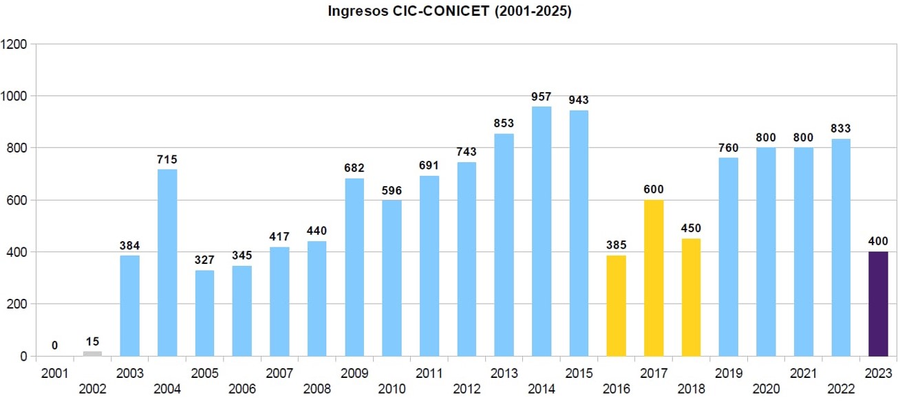 Cabe remarcar que según los datos del Grupo Epc-CIICTI, la evolución de los ingresos al CONICET se mantuvo en ascenso casi hasta los 1000 por año, hasta el 2015, que llegó al poder Mauricio Macri y los redujo a algo más de la mitad. Mas tarde, durante la gestión de Alberto Fernández se recuperaron (ver gráfico), y se derrumbaron a cifras más bajas que las del macrismo, con Milei.