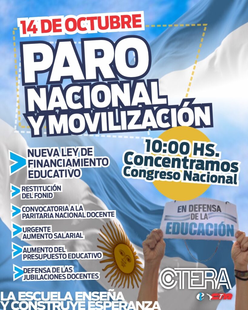 El gremio de docentes Ctera y gremios universitarios realizarán este martes un paro nacional y una movilización al Congreso para reclamar la restitución del Fonid (Fondo de Incentivo Docente), la convocatoria a paritarias y la aplicación de la ley de financiamiento educativo. Exigen al Gobierno que frene el ajuste y garantice fondos para salarios, infraestructura y universidades públicas.