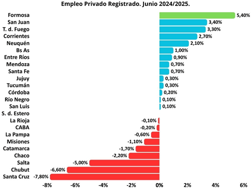 La provincia de Formosa incorporó más de 1.185 trabajadores en el sector privado durante el último año y se posicionó como la jurisdicción de mayor crecimiento, mientras que a nivel nacional se perdieron más de 113 mil puestos desde la llegada de Javier Milei a la presidencia.