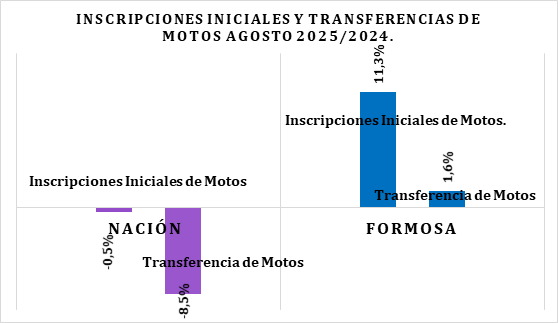 El contraste también se refleja en el rubro automotor. A nivel nacional, en agosto de 2025 las inscripciones iniciales de motos cayeron un 0,5% interanual y las transferencias descendieron un 8,5%. Sin embargo, en Formosa las inscripciones crecieron 11,3% y las transferencias 1,6%, convirtiéndose en la provincia del Nordeste argentino con mayor crecimiento en ambos indicadores.