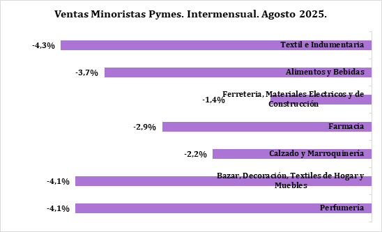 Las consecuencias de estos ajustes son múltiples. Las ventas minoristas pymes registraron en agosto una baja del 2,6% interanual y del 2,2% frente a julio. El rubro “Textil e Indumentaria” fue el más golpeado, con una caída del 4,3%.