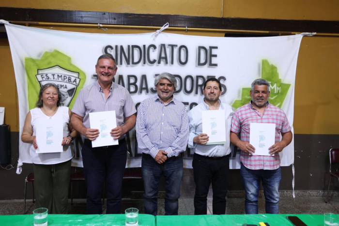 La formalización del convenio se concretó en la sede del Sindicato de Trabajadores Municipales. Allí acompañaron al ministro y al intendente el presidente del Concejo Deliberante, Marcos Jovanovich; representantes de ATE, Mónica Gómez; y de UPCN, Adolfo Méndez. También asistieron la jefa de Gabinete del ministerio, Cecilia Cecchini, y la directora de Coordinación de Negociación Colectiva Municipal, Macarena Kunkel.