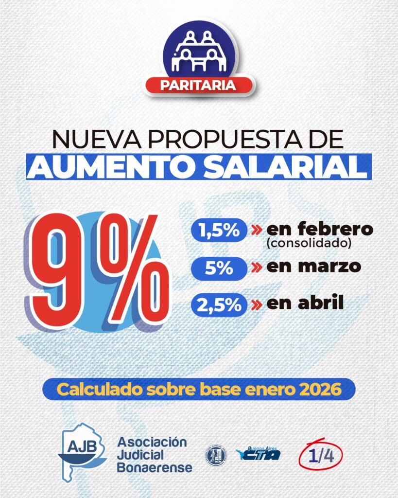 La Asociación Judicial Bonaerense (AJB) informó que el Gobierno de la Provincia de Buenos Aires presentó una nueva propuesta de incremento salarial durante la reunión paritaria realizada este jueves, luego del rechazo sindical a la oferta anterior formulada en febrero. El encuentro se llevó adelante sin la participación de la Suprema Corte de Justicia, ausencia que fue cuestionada por el gremio.