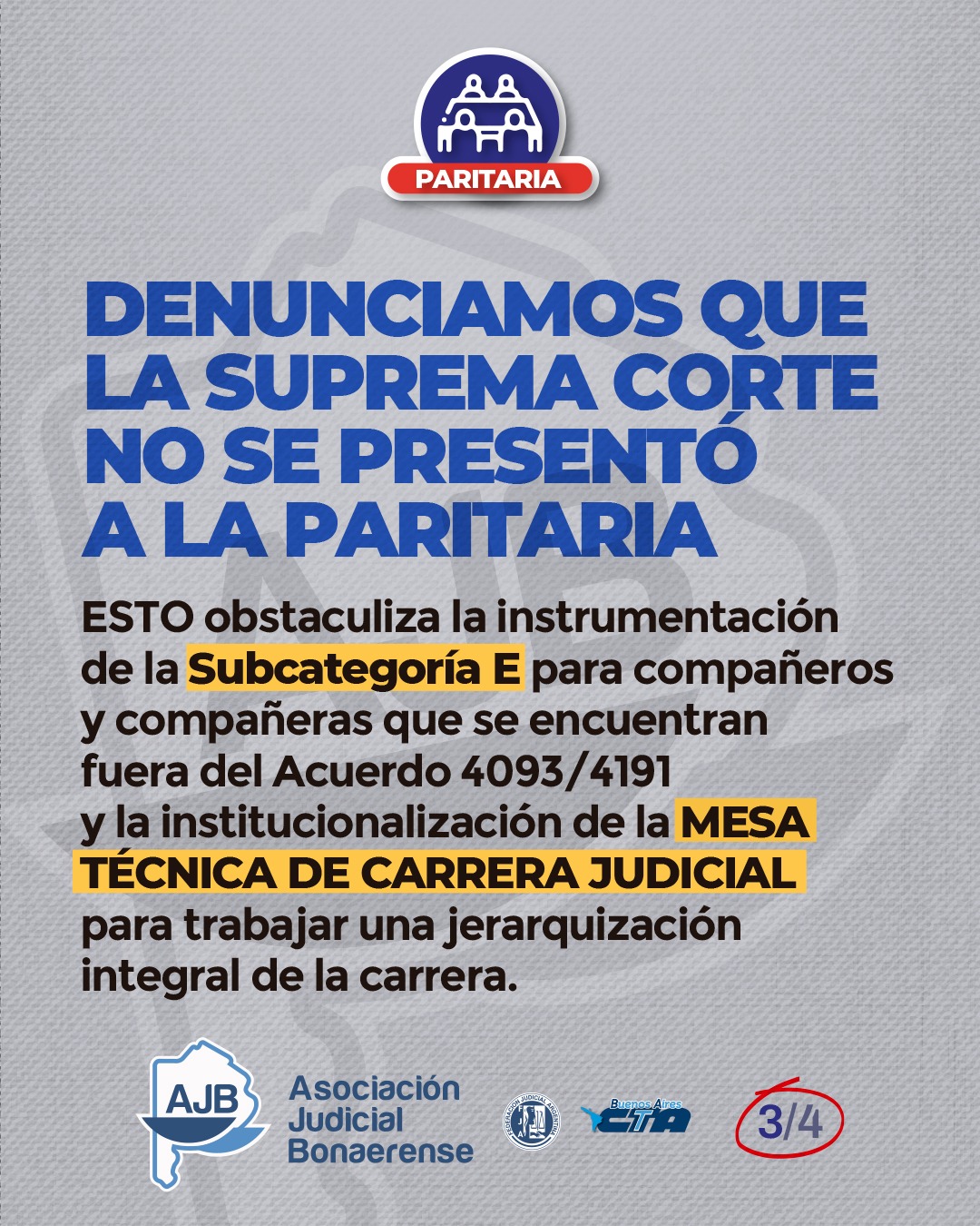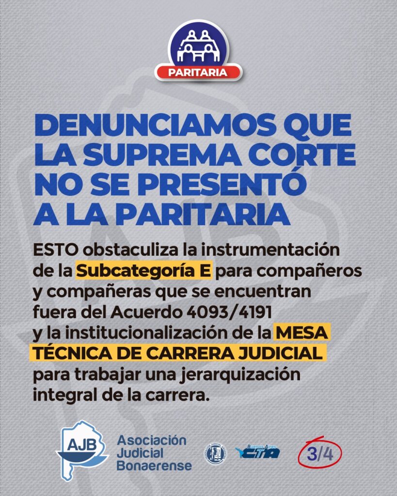Uno de los puntos de conflicto señalados por la AJB fue la ausencia de representantes de la Suprema Corte en la negociación, lo que, según indicaron, impidió avanzar en reclamos específicos vinculados a la estructura del Poder Judicial, como la implementación de mejoras para la subcategoría E y la discusión sobre la carrera judicial.