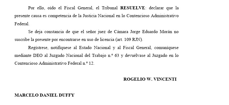 El fallo, al que tuvo acceso este medio, resuelve el conflicto positivo de competencia trabado entre el Juzgado Nacional del Trabajo N° 63 y el Juzgado Contencioso Administrativo Federal N° 12. La decisión, además, marca un precedente en lo que los jueces consideraron un «irregular trámite» del juez laboral, quien en lugar de elevar el conflicto a la Cámara Contencioso Administrativa, que es lo que consideran que debería haber hecho, dispuso remitir las actuaciones a la Cámara Nacional de Apelaciones del Trabajo. «El tribunal competente para resolver el conflicto no puede quedar sometido a un procedimiento deformado y a expensas del trámite que libremente decida aplicar uno de los órganos intervinientes», advirtieron los magistrados.