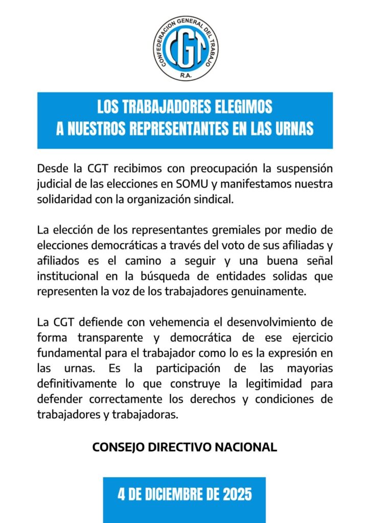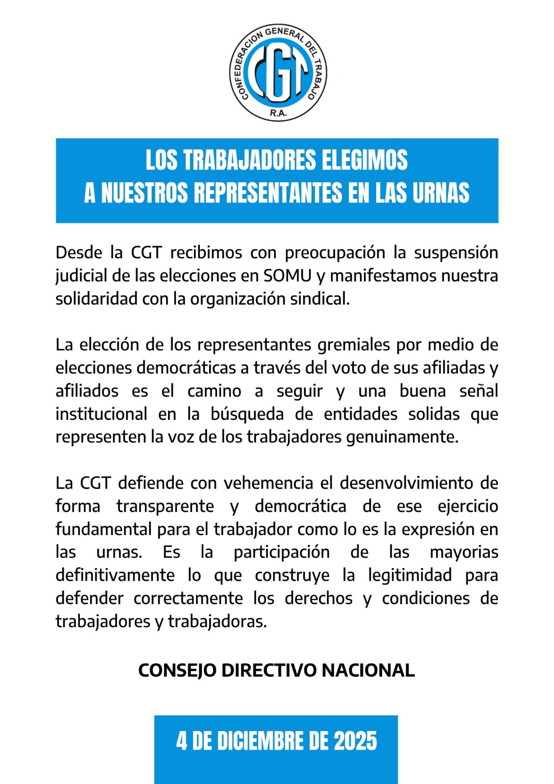Tras el apoyo de la CATT, la CGT también expresó su preocupación por la suspensión judicial de los comicios en el SOMU y defendió la autonomía sindical. La central reivindicó el voto de los afiliados en elecciones «transparentes y democráticas» como pilar de la legitimidad en la representación de los trabajadores.