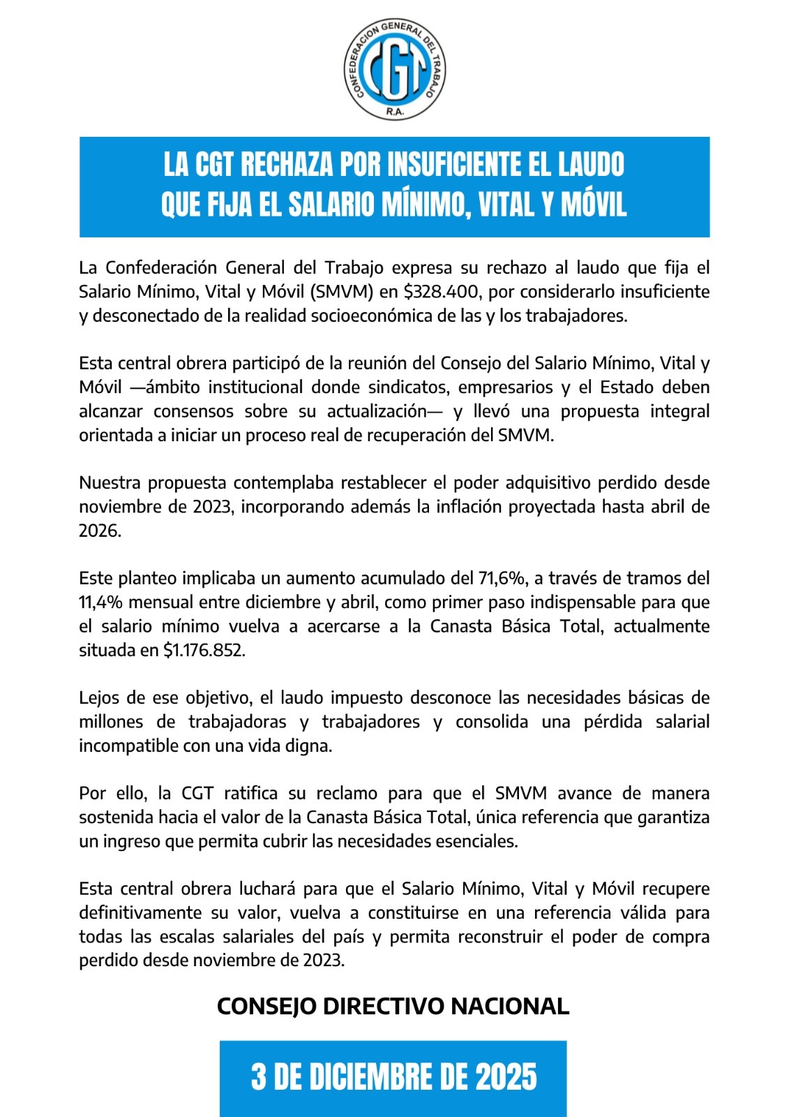 “La lucha es para que el Salario Mínimo, Vital y Móvil recupere definitivamente su valor”, concluyó el Consejo Directivo Nacional en el documento emitido el 3 de diciembre de 2025.