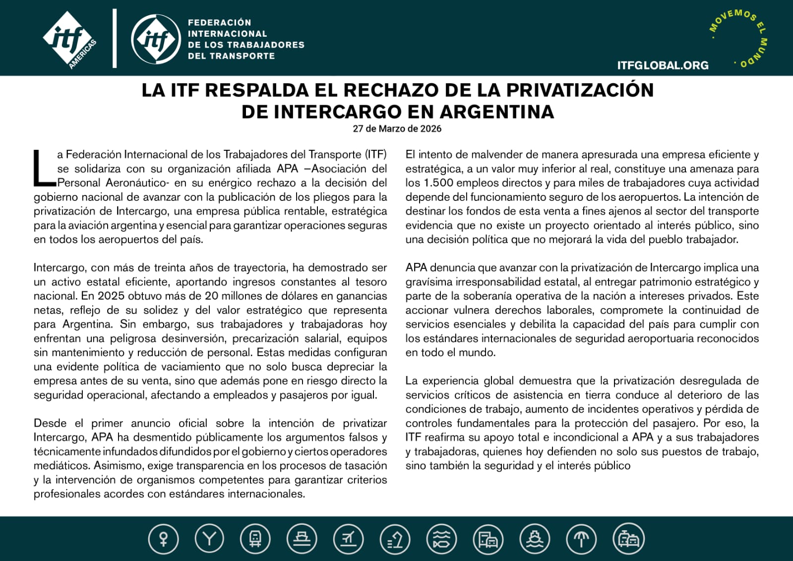 La Federación Internacional de los Trabajadores del Transporte (ITF) expresó su respaldo a la Asociación del Personal Aeronáutico (APA) en su rechazo a la privatización de Intercargo, la empresa estatal encargada de los servicios de asistencia en tierra en los aeropuertos argentinos.