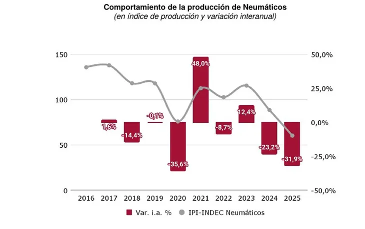 De acuerdo con el informe, la producción de neumáticos registró en 2025 una caída del 33 % respecto a 2023, al pasar de 9 millones a 6 millones de unidades fabricadas. A su vez, el nivel de utilización de la capacidad instalada se redujo hasta el 33,4 % en diciembre de ese año, lo que representa una baja interanual de 8,6 puntos porcentuales.