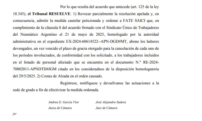 El fallo se dictó en el marco de un recurso de amparo presentado por el sindicato, luego de que la organización denunciara un “lock out ilegal” por parte de la empresa. Según el SUTNA, Fate había asumido el compromiso de no realizar despidos hasta julio de 2026, lo que fue considerado un elemento central en la resolución judicial.