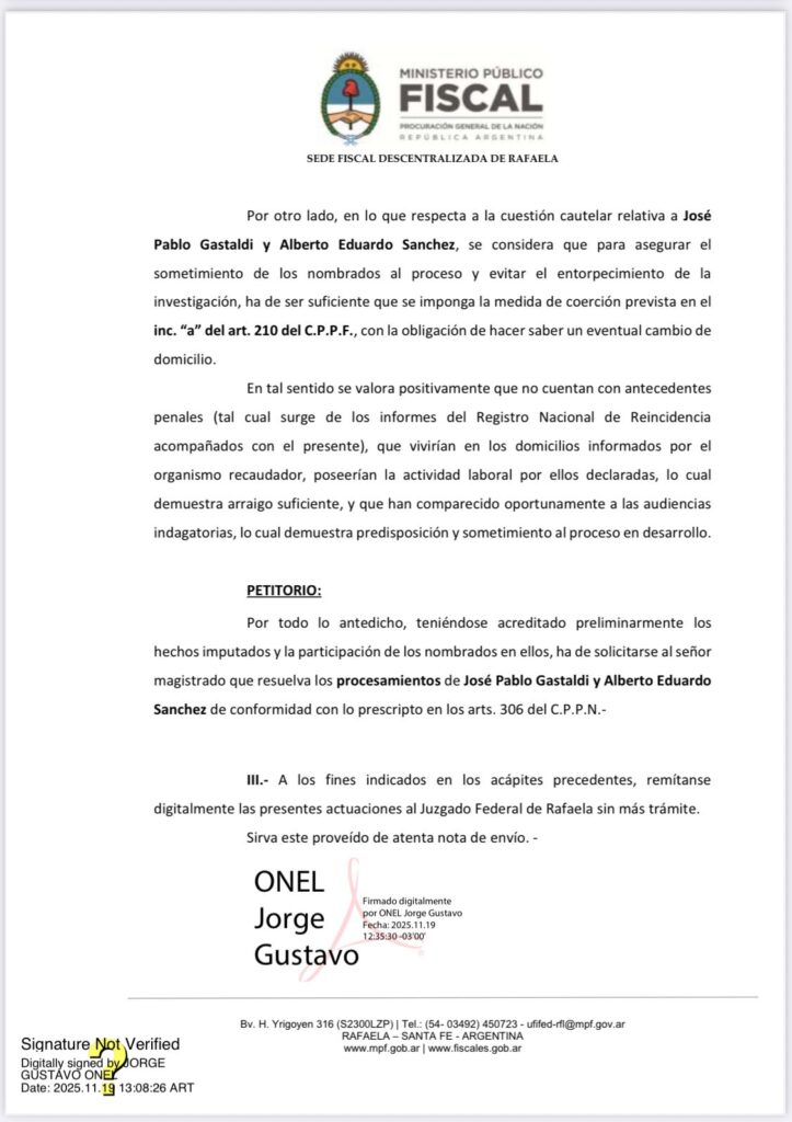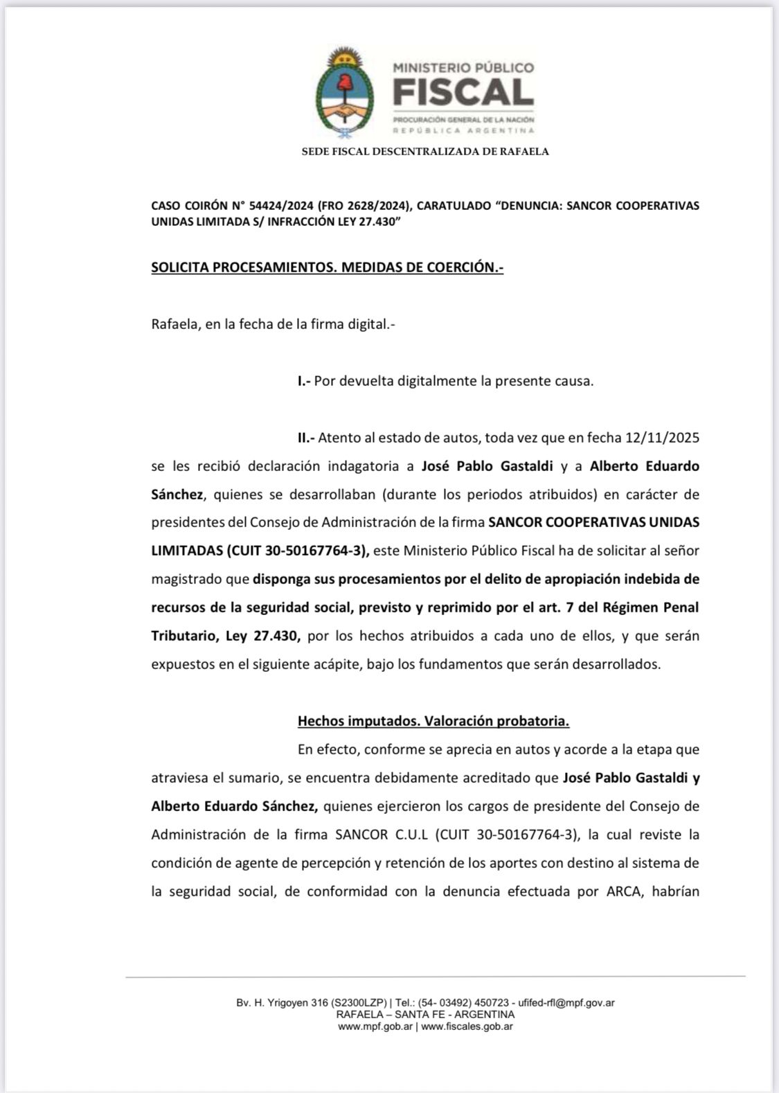El pedido del Ministerio Público Fiscal alcanza a José Pablo Gastaldi y Alberto Eduardo Sánchez, quienes ejercieron la presidencia de la cooperativa en distintos períodos. La solicitud fue elevada al Juzgado Federal de Rafaela en el marco del expediente «Sancor Cooperativas Unidas Limitadas s/ Infracción Ley 27.430».