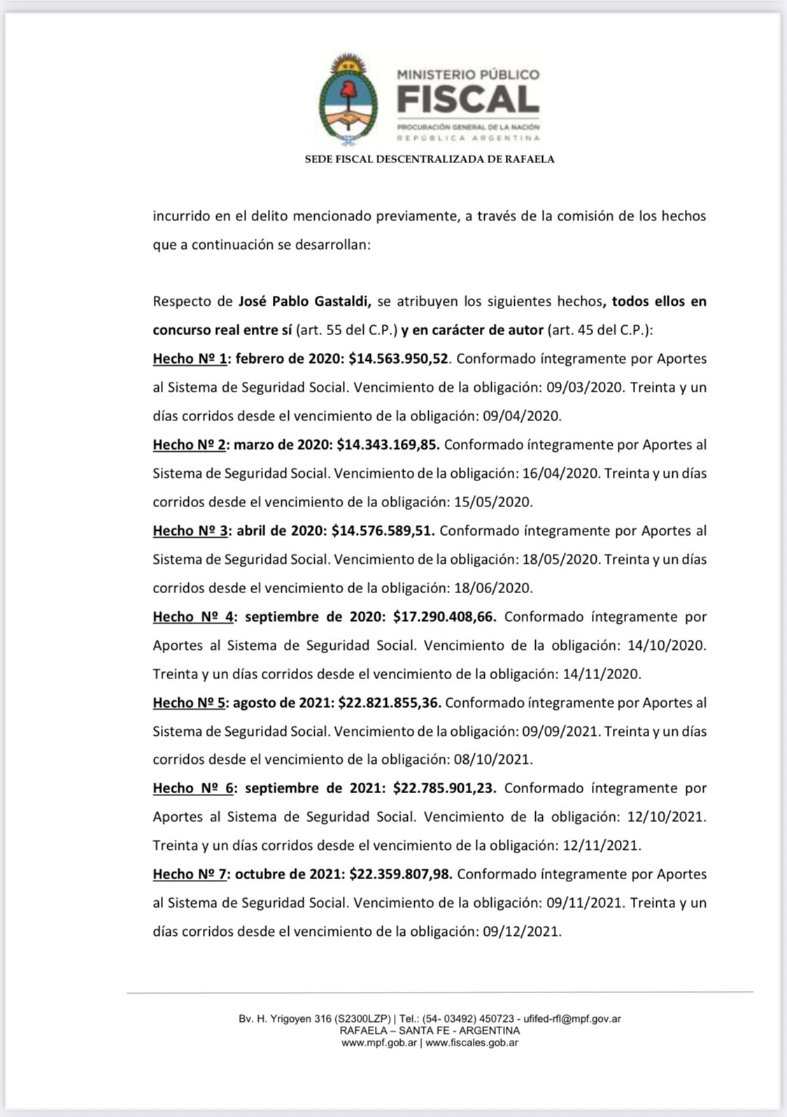 En el caso de José Pablo Gastaldi, quien presidió el Consejo de Administración entre febrero de 2020 y octubre de 2022, la fiscalía le imputa siete hechos de apropiación indebida de aportes previsionales, correspondientes a febrero, marzo, abril y septiembre de 2020, y a agosto, septiembre y octubre de 2021, por un monto total de $128.741.679, siempre por aportes al Sistema de Seguridad Social que fueron retenidos a los trabajadores pero no ingresados.