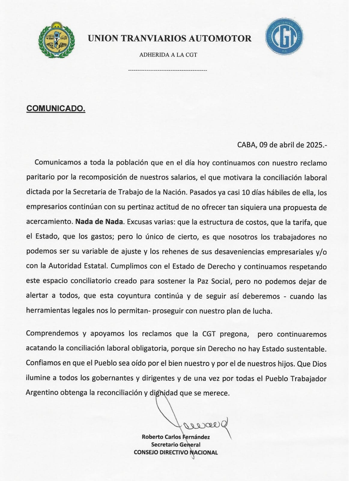 La Unión Tranviarios Automotor (UTA) emitió este miércoles un comunicado en el que reafirma su reclamo paritario por la recomposición salarial de los choferes de colectivos y advierte sobre la falta de avances en las negociaciones con el sector empresario.