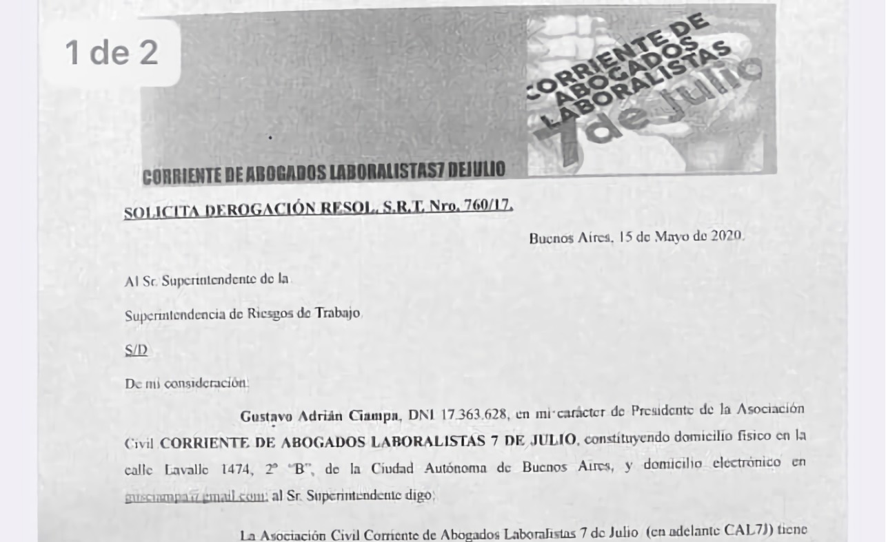 La Corriente de Abogados Labolistas 7 de julio que se referencia con Héctor Recalde, elevó ayer una nota al superintendente de Riesgos del Trabajo, Gustavo Moron, en la que le pide que la Resolución N° 760/17 que creaba una lista de abogados laboralistas y trabajadores que iniciaren juicios laborales.