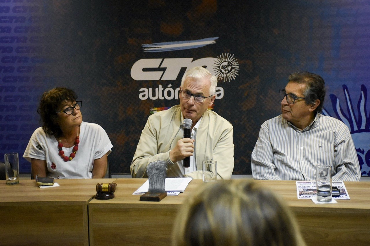 Hugo “Cachorro” Godoy, Secretario General de la CTA Autónoma, abrió la actividad celebrando la presencia del Juez en la Central y destacando su labor histórica: “Se abrió la posibilidad, a través del trabajo del Juez Garzón, del Fiscal Castesana y de Carlos Slepoy, la posibilidad de nuestro pueblo de no olvidar, no reconciliar y promover el juicio y castigo por los crímenes de la dictadura militar. Todos los que estamos acá somos dirigentes de ambas CTA, y en nombre de nuestra Central, queríamos hacer un reconocimiento por este hito histórico que vos impulsaste y que hoy sigue ocurriendo en Argentina con los juicios por lesa humanidad”.
