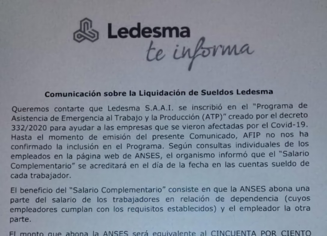 «Queremos contarte que Ledesma SAIC se inscribió en el «Programa de Asistencia de Emergencia al Trabajo y la Producción», abre la comunicación que el poderoso grupo económico de la familia Blaquier le envió a sus empleados el viernes.