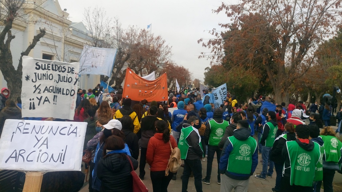 Los gremios estatales de Chubut representados en el Frente de Unidad Sindical se concentraron ayer frente a casa de gobierno ocupando toda la peatonal Fontana de Rawson, en la capital provincial, para reclamar que «den respuesta al atraso salarial».