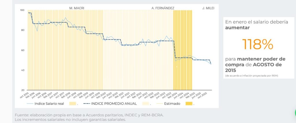El estudio afirmó que durante el actual gobierno “se observa una consolidación de la depreciación acelerada del salario ocurrida durante los primeros meses del gobierno, sobre una base que ya históricamente era baja”.