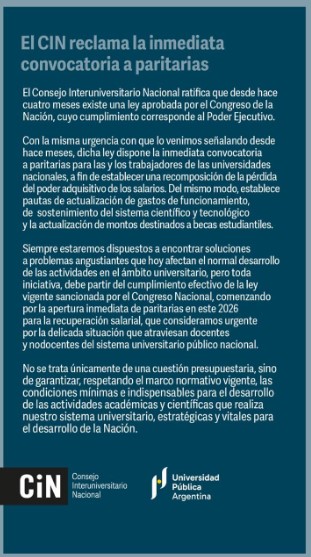 Finalmente, el CIN advirtió que el fortalecimiento del sistema universitario resulta estratégico y vital para el desarrollo del país, y reiteró su pedido para que el Ejecutivo cumpla la normativa vigente y convoque sin demora a la negociación salarial.