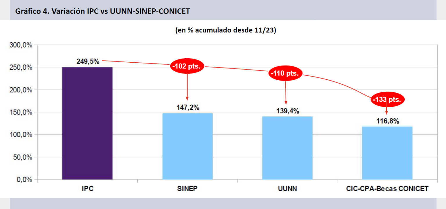 Con la publicación del Índice de Precios al Consumidor del mes de noviembre -2,5% según el INDEC- se confirmó la profundización de la tendencia a la baja de los salarios en todos los segmentos en los que los investigadores argentinos realizan sus actividades.