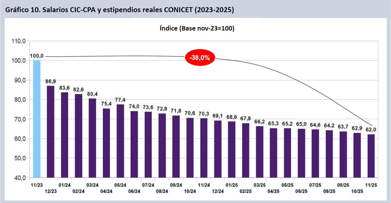 En noviembre, los salarios de investigadores y estipendios del CONICET continuaron cayendo ya que recibieron apenas un incremento nominal del 1,1% frente al alza de precios del 2,5%. Bajo el gobierno de Javier Milei, declinaron casi todos los meses hasta alcanzar un nivel que se encuentra 38% por debajo de noviembre de 2023 medido en términos reales.