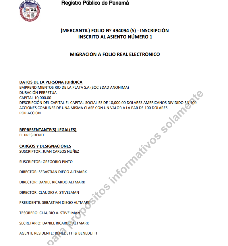 Se trata de dos firmas radicadas en Panamá, al menos una de ellas vinculada a la salud. En una Claudio Stivelman, el Superintendente de Servicios de Salud, aparece como Director y Tesorero y en la otra ocupa el cargo de Tesorero, por lo que en ambas tiene el manejo de la caja. Panamá se suele utilizar como destino para exteriorizar rentas y eludir el pago de impuestos.
