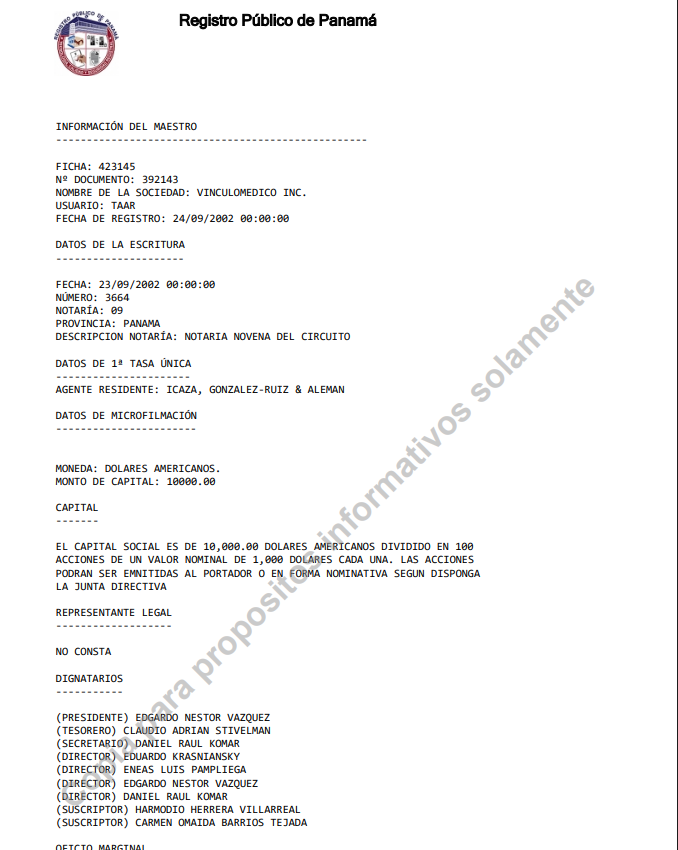 Además desde 2002 el propio Stivelman es el tesorero de VINCULOMEDICO INC, otra empresa radicada en Panamá desde el 24 de septiembre de 2002. Allí el director inscripto es Edgardo Néstor Vázquez, otro médico por lo que se descuenta la actividad en salud de la firma.