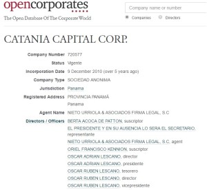 La primera de las corporaciones radicadas en Panamá que tiene a Oscar Adrián Lescano como Presidente y director, se creó el 11 de mayo de 2010 y se llama CATANIA CAPITAL CORP. La Sociedad Anónima asentada en tierra offshore, también cuenta en su directorio con Oscar Rubén Lescano y a Ulises Lescano.